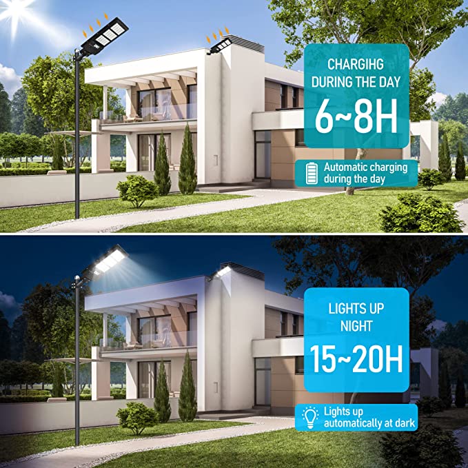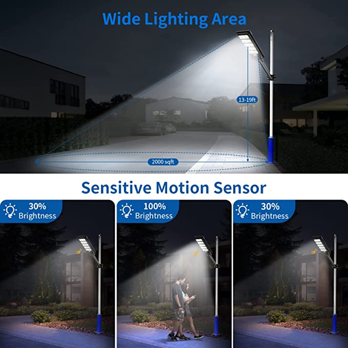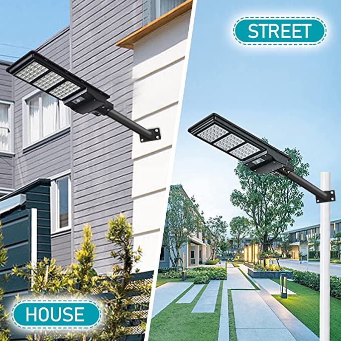 Super Bright LED Light: Solar street lights has SMD 144 LED, alight white 6000K,120°ultra-wide angle lighting, the irradiation area up to 1610sq.ft. Everything is clear at night under this solar floodlight. Suitable for courtyard, garden, street, square, farm, sidewalk, ranch, parking lot.
